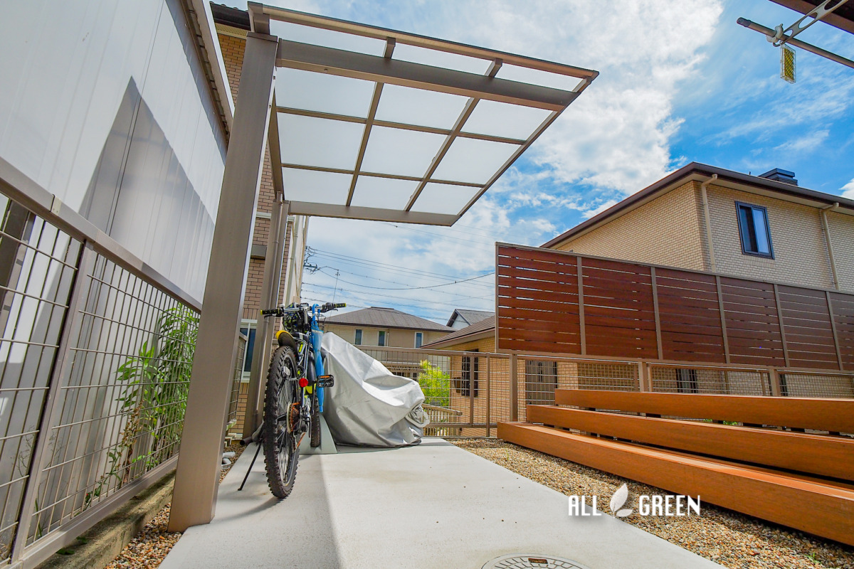 邸宅正面から邸宅の側面通路を通り抜けてたどりつくサイクルポートはカーポートで聞き馴染みのあるLIXILのネスカシリーズのネスカFミニという商品。