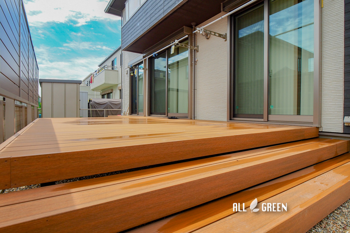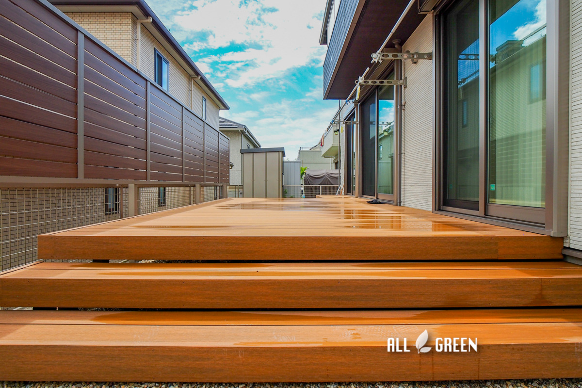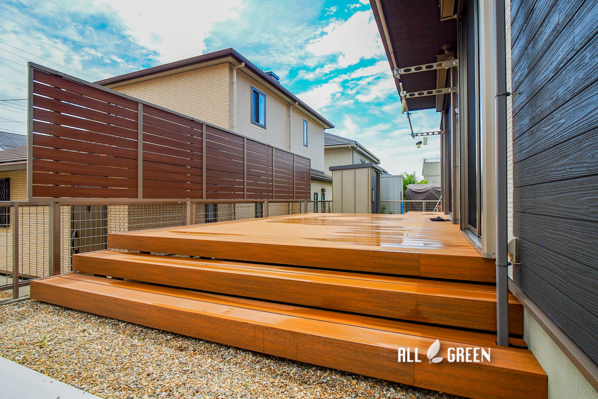 ゴミ置き場や物置がお庭にあるためデッキからお庭に移動しやすいよう施工しています。