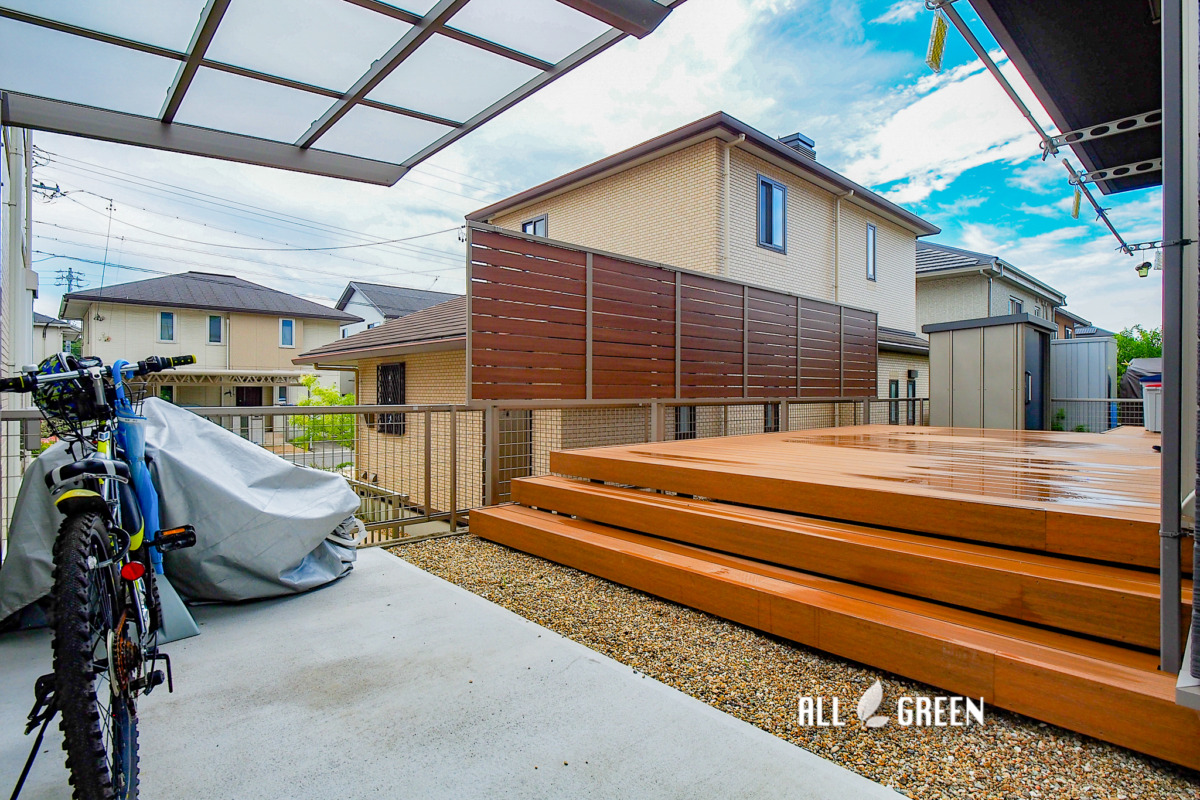 ウッドデッキ、駐輪場、サイクルポート、目隠しフェンス、川砂利敷き