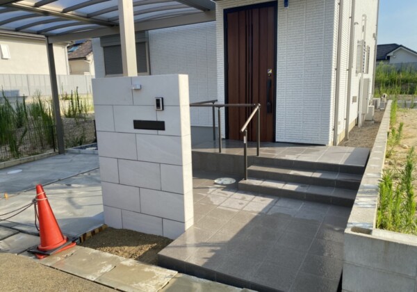 玄関ポーチの手摺りが完成しました。 少し高さのある現場ポーチなので手摺りが必要ですね。 タイルも綺麗に仕上がり、残すは植栽です。...