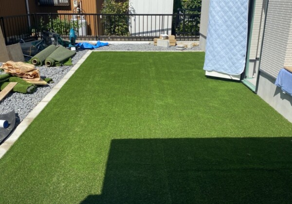 人工芝が完成しました。 天然芝と見間違えるほどの製品です。 メンテナンス不要でストレスの無いですね。