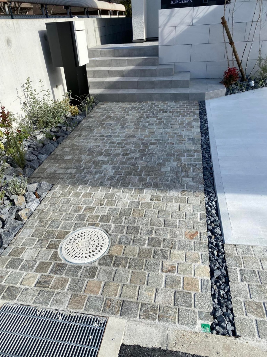 このコーティングはアプローチ部分の石だけでなく、駐車スペース手前や駐車スペースの目地に使用された石にも塗っています👀