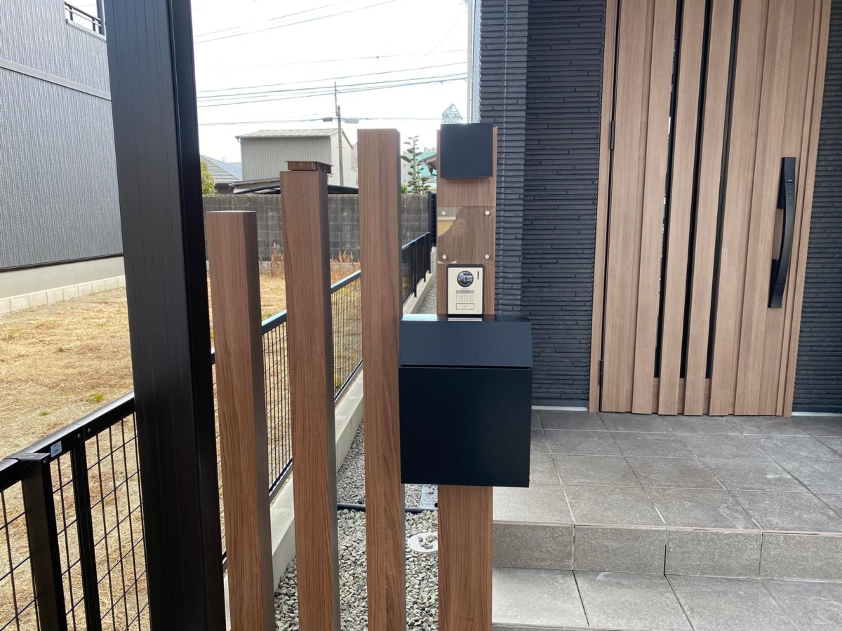 高さの違う木調の角材を4本並べポストと表札とインターホンと照明を設置❗❗