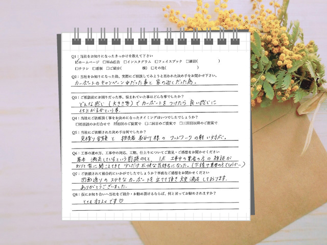 図面通りのステキなカーポートを立てて頂き、大変満足しております。