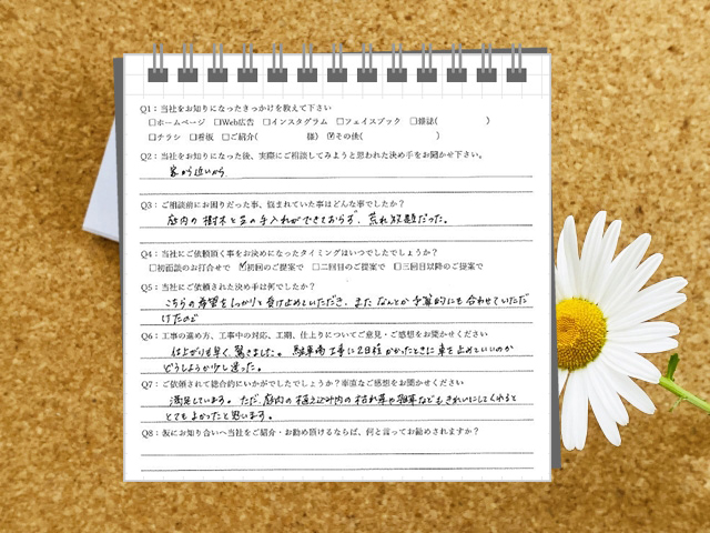 Q6:工事の進め方、工事中の対応、工期、仕上がりについてご意見・ご感想をお聞かせください