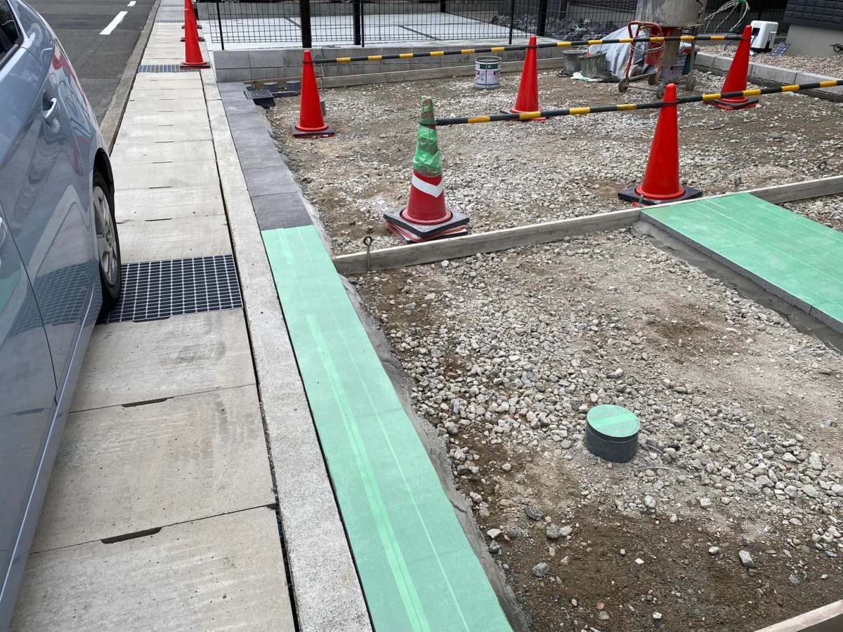 このあと養生がされている部分に洗い出しコンクリートを、コーンが置いてある側に土間コンクリートが打設される予定です❗❗