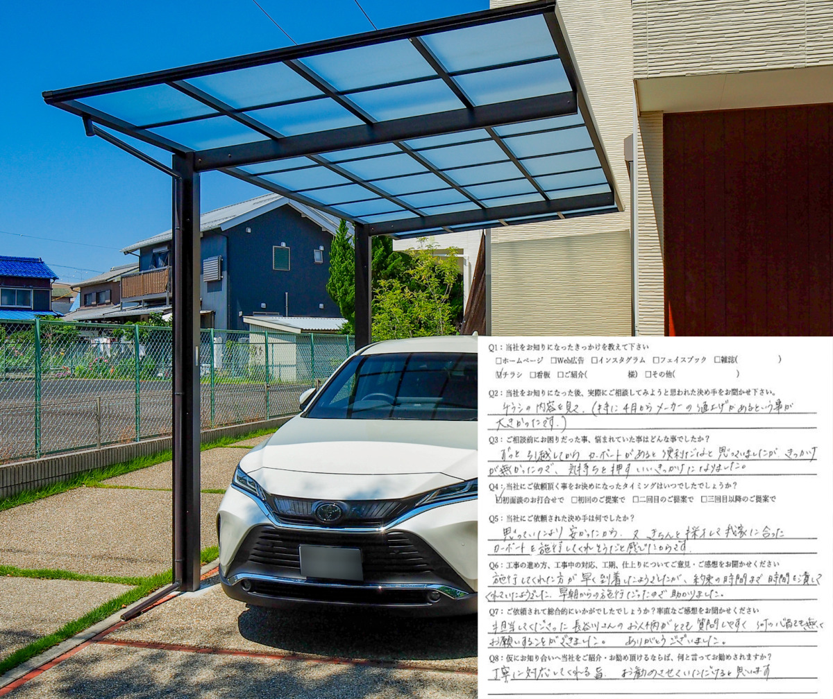 ずっと引越してからカーポートがあると便利だなと思っていましたが、きっかけが無かったので、気持ちを押すいいきっかけになりました。