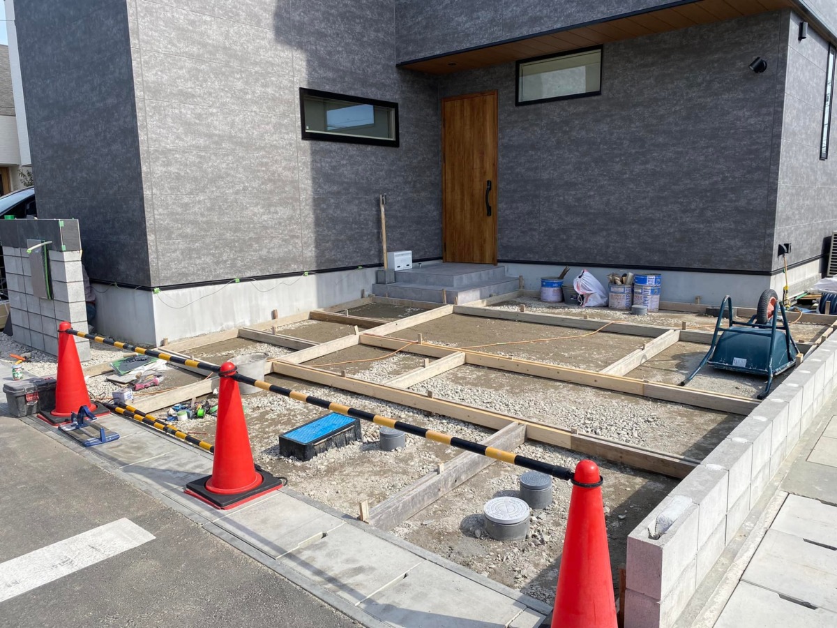 コーンを置いて立ち入れないようにしているという事は、土間コンクリートを乾かしている途中なんですね~❗❗