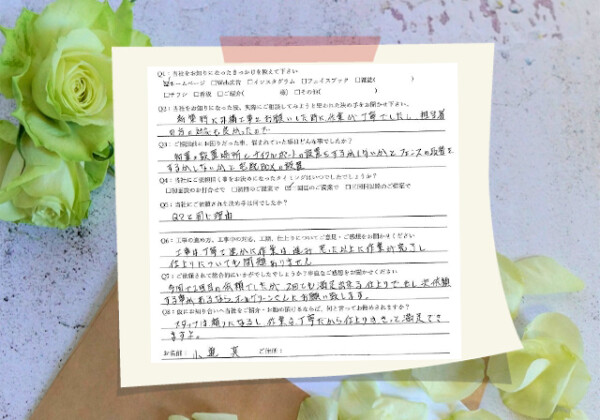 新築時に外構工事をお願いして、その時の作業が丁寧で担当者さんの対応も... Q1:当社をお知りになったきっかけを教えてください ☑ ホームページ Q2:当社をお知りになった後、実際にご相談し... 2022.07.02