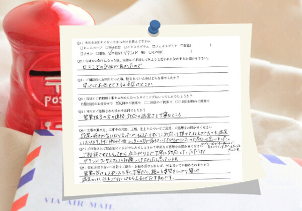設置時少し傾きが気になったので連絡をするとすぐに対応をしていただけま... Q1:当社をお知りになったきっかけを教えてください ☑ ご紹介( リクシル 様 ) Q2:当社をお知りになった後、... 2022.07.03