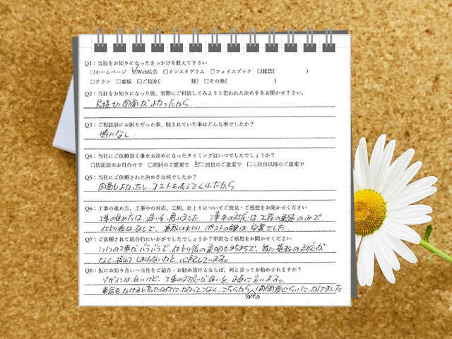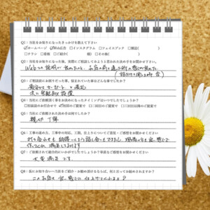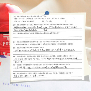 工事の進め方は遅いと思いました。工事の対応は工程の連絡のみで仕上り後はなしで、植栽の水やり、ポストの鍵は放置でした。