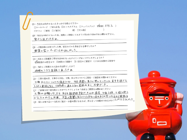 工期が延期になったり、当日も朝開始予定だったのが昼前、午後2時と後ろ倒しになったのが少し不満。