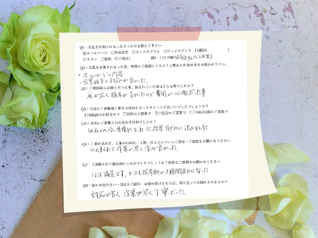 営業担当さんの対応が良く、工事も4名できていただきスピーディーかつ丁寧に終わりました!除草剤の作業が遅れてしまったのが残念だったけどほぼ満足です!名古屋市天白区/U邸