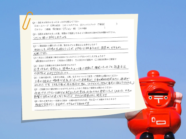 他社にできないと断られたテラスの工事が私たちの希望に沿った形で設置でき満足です!天気が曖昧で当日工事を行えるのかどうか、もう少し早く連絡をもらえたらなおよかったです。名古屋市緑区/W邸