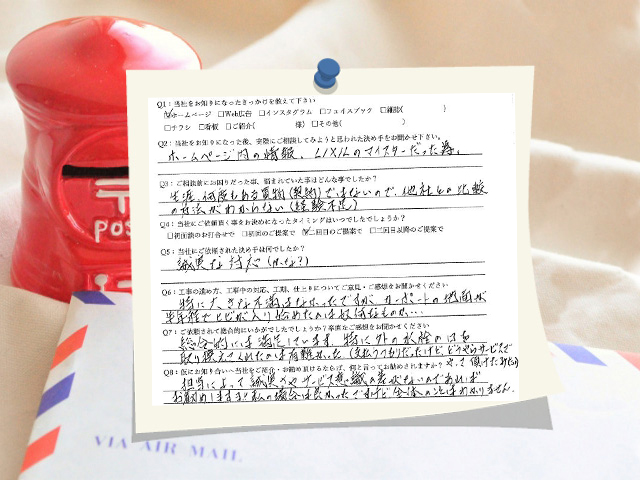 総合的には満足しています。特に水栓の口を取り換えてくれたのがとても有難かったです!工事中の大きな不満もなかったんですが、カーポートの地面が半年ほどでヒビが入ってしまい残念でした。名古屋市天白区/O邸
