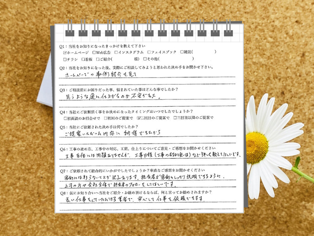 Q6:工事の進め方、工事中の対応、工期、仕上がりについてご意見・ご感想をお聞かせください
