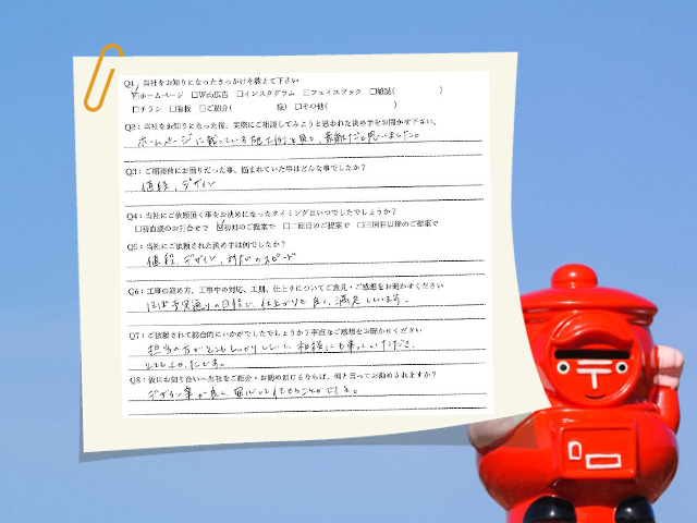 ほぼ予定通りの日程で、仕上がりも良く、満足しています。
