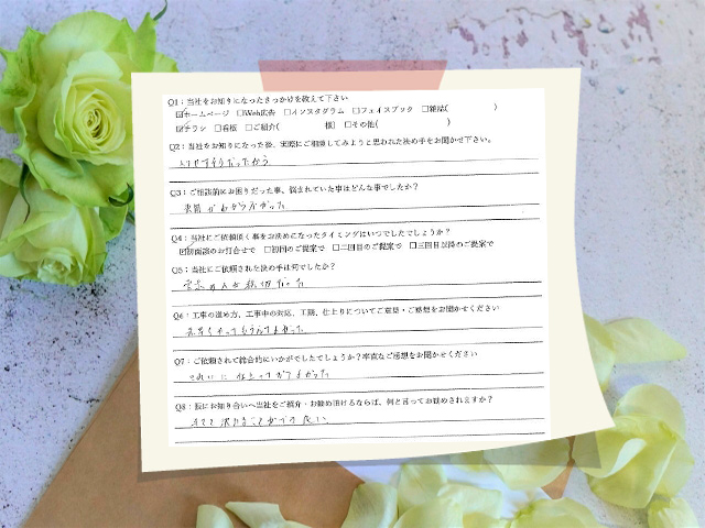 Q6:工事の進め方、工事中の対応、工期、仕上がりについてご意見・ご感想をお聞かせください