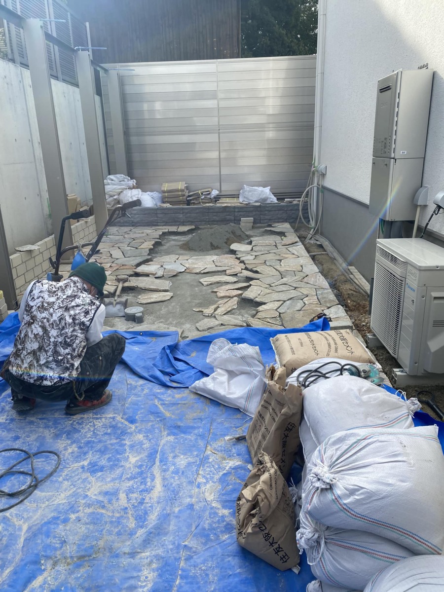 前回のブログにのせた写真と見比べるとめちゃくちゃ乱形石貼りの作業が進んでいますね😲❗❗