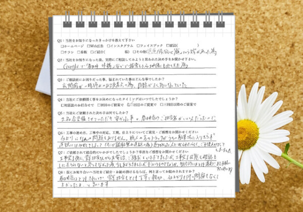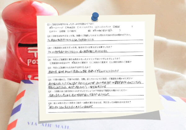 Q1:当社をお知りになったきっかけを教えてください ☑ ホームページ Q2:当社をお知りになった後、実際にご相談し...