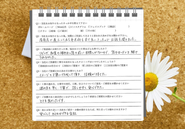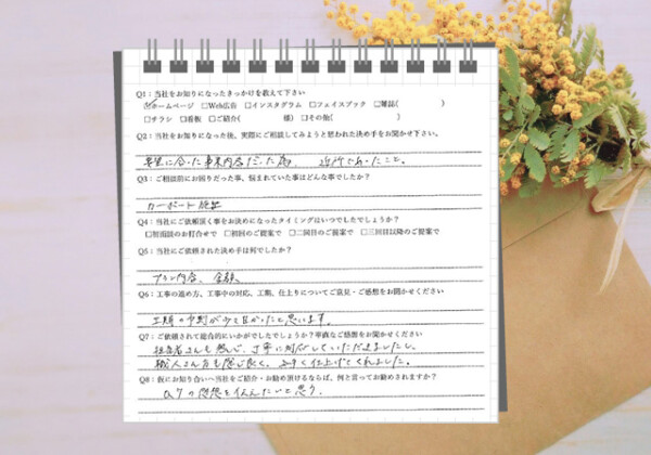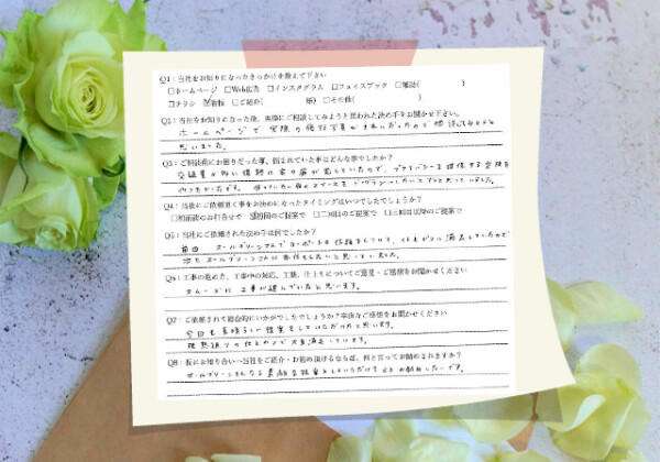 Q1:当社をお知りになったきっかけを教えてください ☑ その他( 家が近いため ) Q2:当社をお知りになった後、...