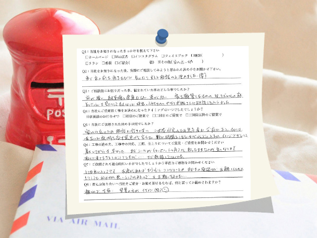 家が近く、車でお店の前を通るたび気になっていました!まだ気になるところがあるので、またお願いするかも!親切で丁寧そしてイケメンな担当営業さんでした(笑)愛知県清須市/N邸