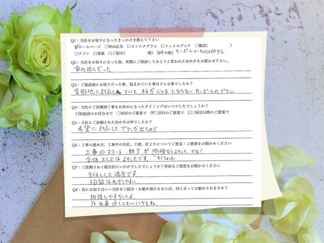 変形地に対応していて、柱が邪魔にならないカーポートのプランを相談しました。工事のスタート、終了がもうちょっと明確ならよかったが、全体としては満足です。名古屋市天白区/I邸