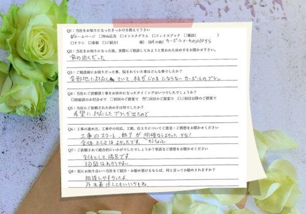 Q1:当社をお知りになったきっかけを教えてください ☑ ホームページ ☑ その他(カーポートメーカ...
