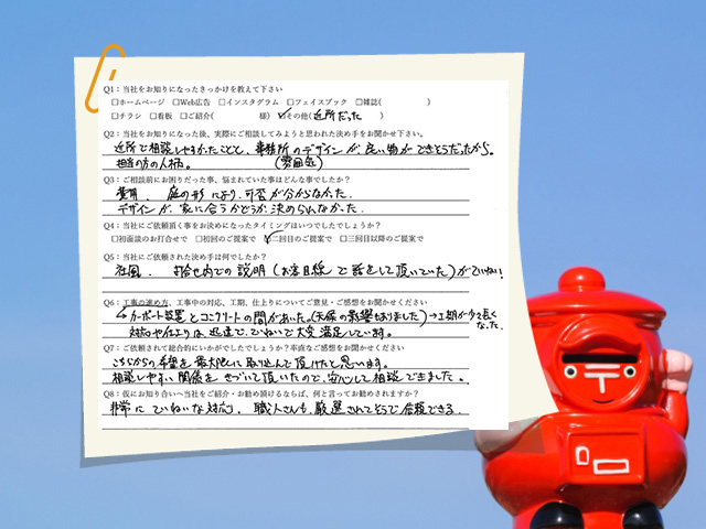 近所で相談しやすかったことと、事務所のデザイン(雰囲気)が、良いものが出来そうだったから。