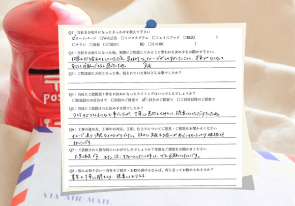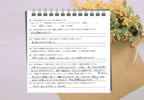 Q1:当社をお知りになったきっかけを教えてください ☑ ホームページ Q2:当社をお知りになった後、実際にご相談し...