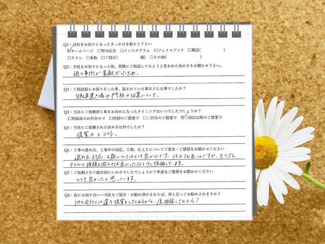 進め方、対応、工期についてはとても良かったです。仕上がりも良いのですが、もう少しタイルの種類を減らせば良かったかなと少し後悔しています。依頼をして総合的には、とても良かったと思っています!名古屋市千種区/K様邸