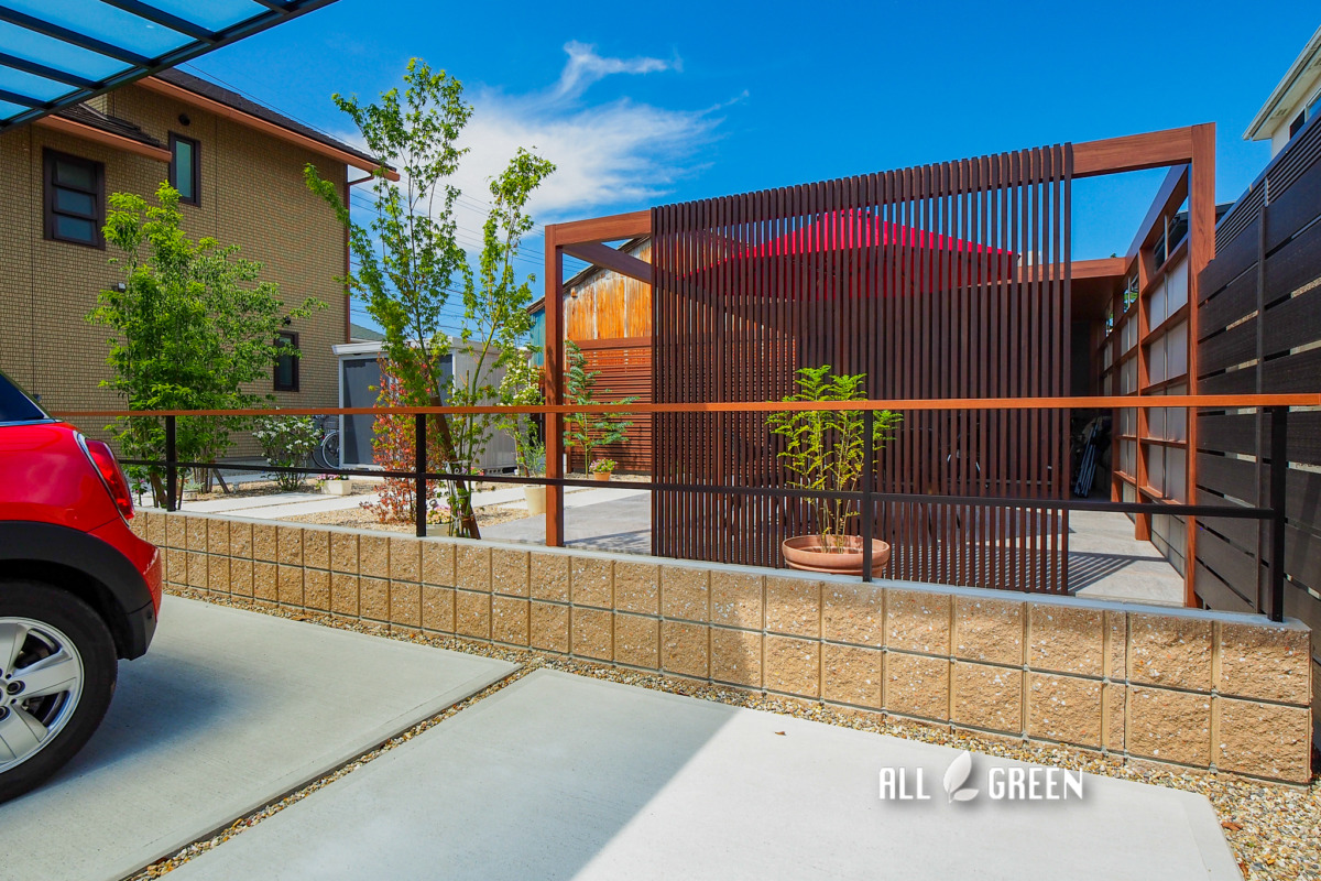 駐車場、カーポート、テラス、タイルテラス、門扉、枕木、アプローチ、フェンス、目隠しフェンス、物置、照明、植栽