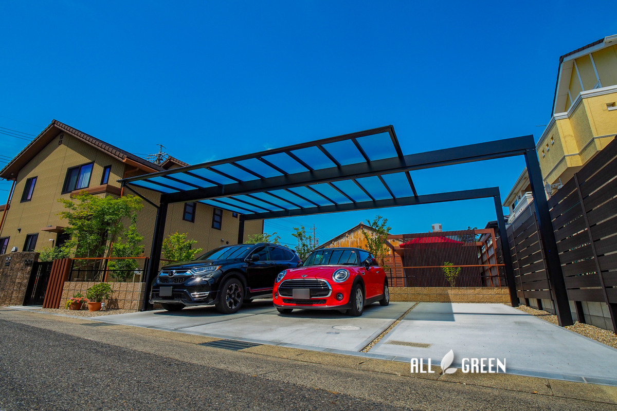 カーポートは三協アルミのスカイリードを梁延長し、施工しています。そうすることで敷地めいっぱいの位置に柱を持ってくることができ、駐車空間をより広く使うことができます。