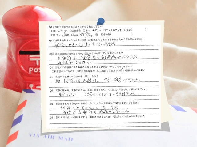 • 玄関前が飲食店の駐車場のため、目線が気になっていました。以前もお願いし、十分に満足したため今回もALLGREENにお願いしました。相談しやすい点は良いため、今後、点検等もお願いしたいです。名古屋市天白区/I様邸