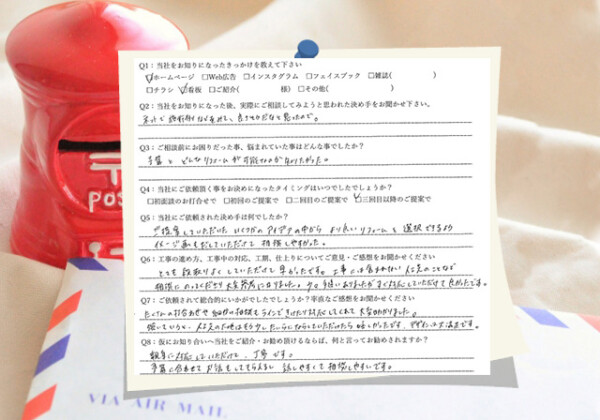 Q1:当社をお知りになったきっかけを教えてください ☑ ホームページ Q2:当社をお知りになった後、実際にご相談し...