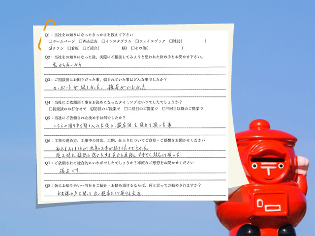 施工時に疑問に感じたことはすぐに連絡し、すばやく対応していただいた。