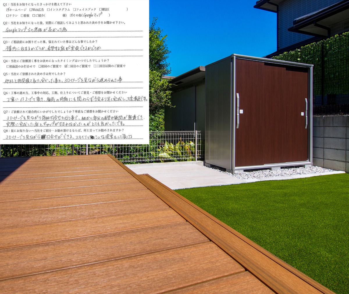 Googleマップでの評価が高かったので相談に行きました。3Dイメージを見ながら詳細打ち合わせを行うことで、細かい部分の希望や疑問が解消できました。実際に完成した庭とギャップが生まれなかったのがとても良かったです!名古屋市緑区/I様邸