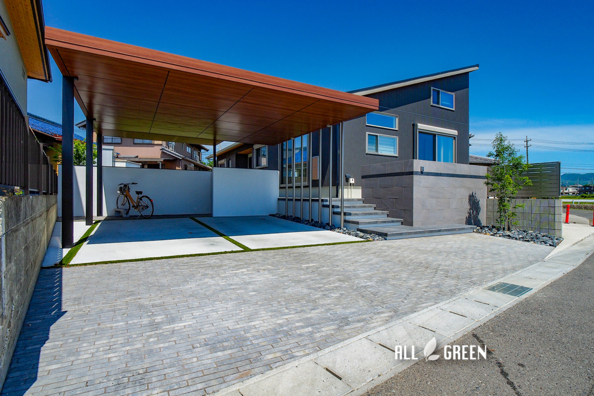 三重県員弁郡 重厚感のある平屋の印象を損なわない木目の天井材を使用した迫力のあるカーポートで魅せるモダンな新築外構