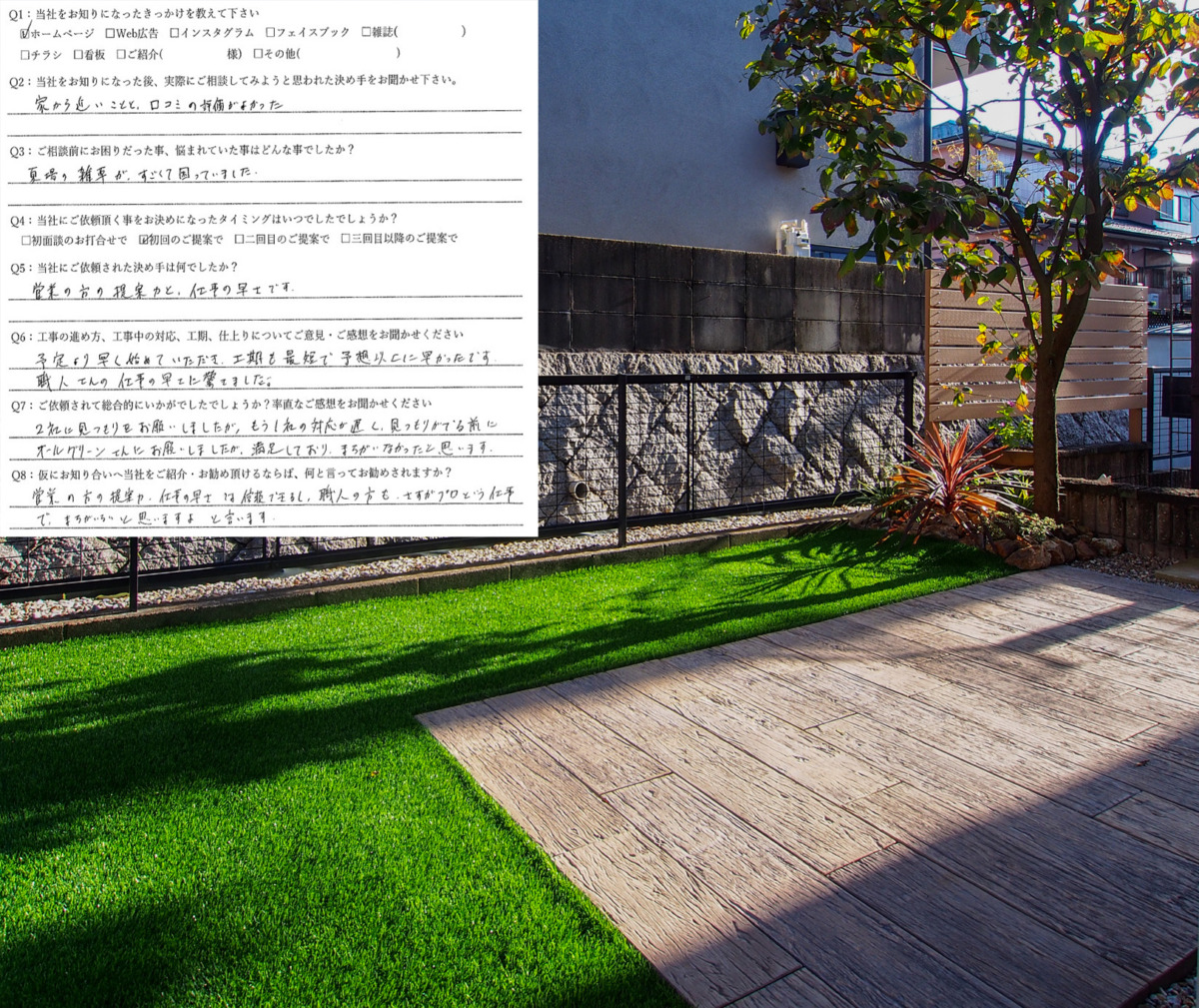 二社に見積もりをお願いしましたが、もう1社の対応が遅く、見積もりが出る前にオールグリーンさんにお願いしました。お願いして満足しており、間違いなかったと思います!名古屋市緑区/K様邸