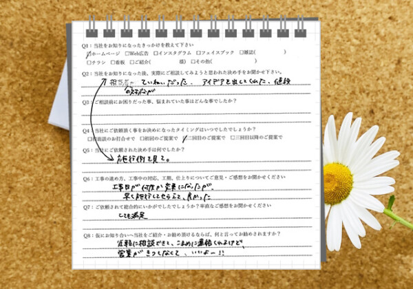 工事日が何度か変更になったが、早く施工してもらえて良かったです。担当... Q1:当社をお知りになったきっかけを教えてください ☑ ホームページ Q2:当社をお知りになった後、実際にご相談し... 2023.08.19