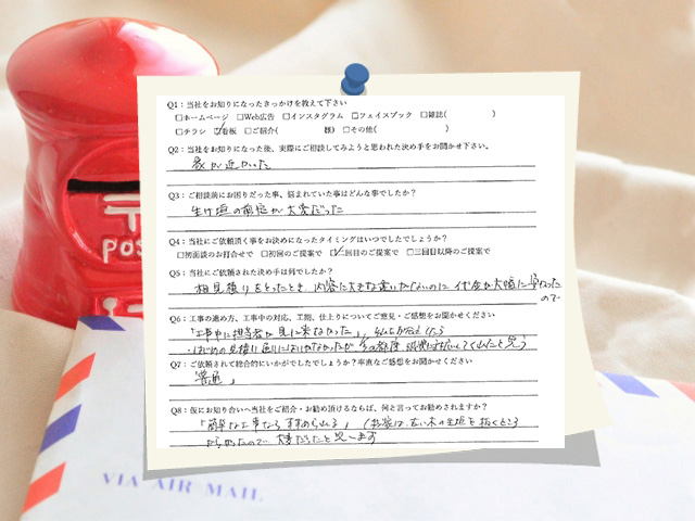 はじめの見積もり通りにはいかなかったが、それをお伝えしたらその都度誠実に対応してくれたと思う。