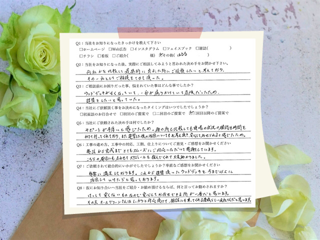 非常に満足しております。これから建替えいただいたウッドデッキを今まで以上に活用していけたらと思っております。