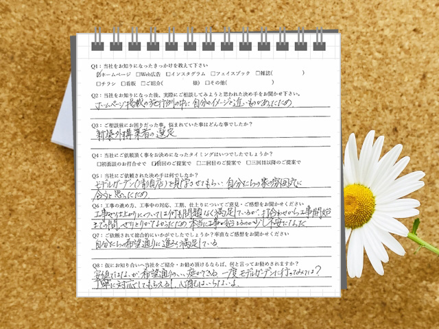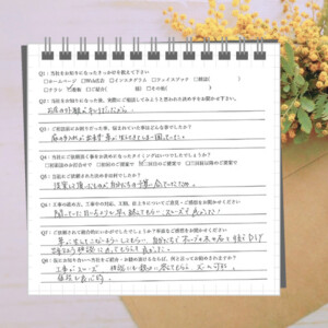工事や仕上がりについては何も問題なく満足しているが、打合せから工事開始までの間、やりとりがなかったため本当に工事が始まるのか少し不安になった。