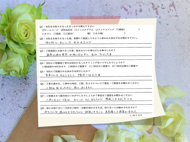 担当さんが穏やかな方だったので、相談しやすいし、再見積もりの提案が早かったと伝えます。
