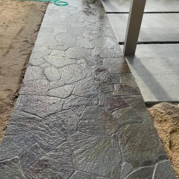 アプローチの石貼りが完成しました。 天然石を1枚づつ形を割って揃えて施工 しました。 1枚1枚加工してますので、すごく綺麗ですね...