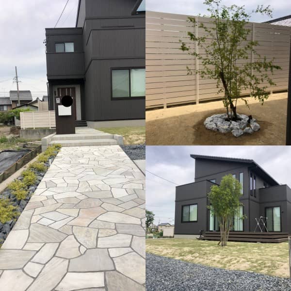 いよいよ植栽です。 アプローチに機能門柱とシンボルツリーと割グリ石の組合せです。 左側のフェンスには下草でアクセントをしました。...