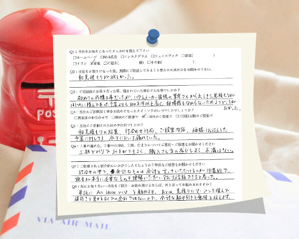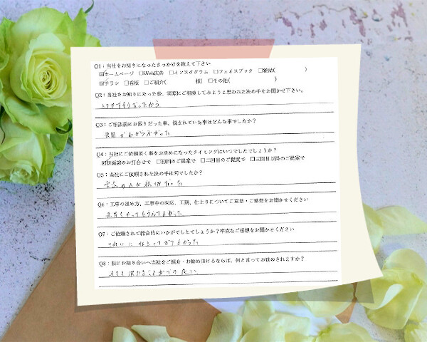 Q1:当社をお知りになったきっかけを教えてください ☑ その他( 隣地の補修工事を見て ) Q2:当社をお知りにな...