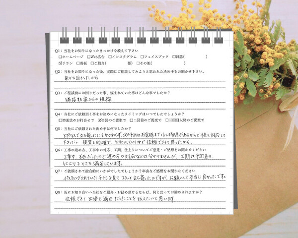 Q1:当社をお知りになったきっかけを教えてください ☑ ホームページ ☑ 看板 Q2:当社をお知りに...